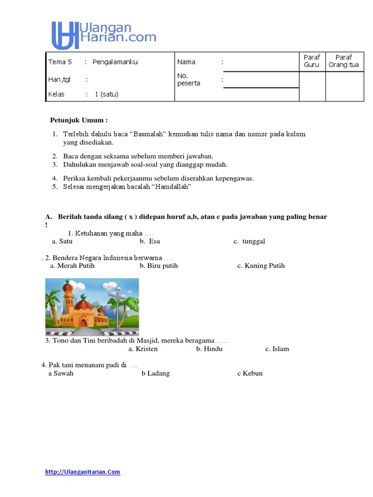 Contoh Soal Ulangan Tematik Kelas 1 Sd Tema 5 Pengalamanku Docx