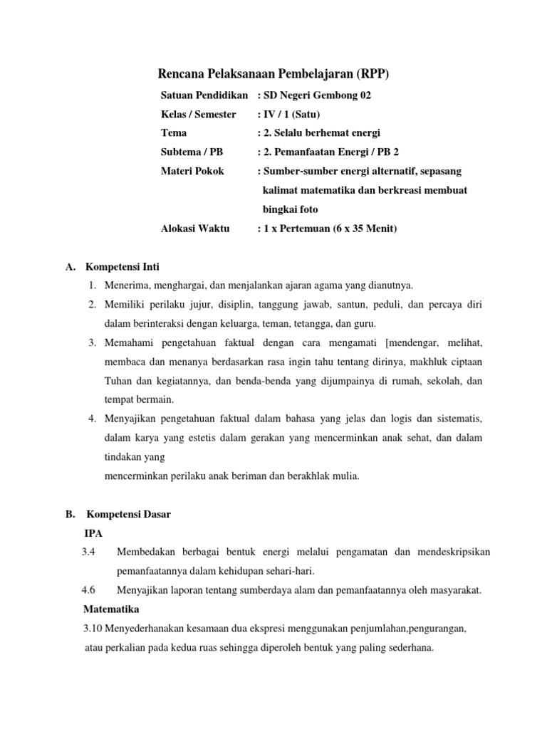 Rpp K13 Kelas 3 Tema 6 Subtema 1 Sumber Energi Revisi Terbaru Semester 2 Tahun 2018 Info Pendidikan Terbaru