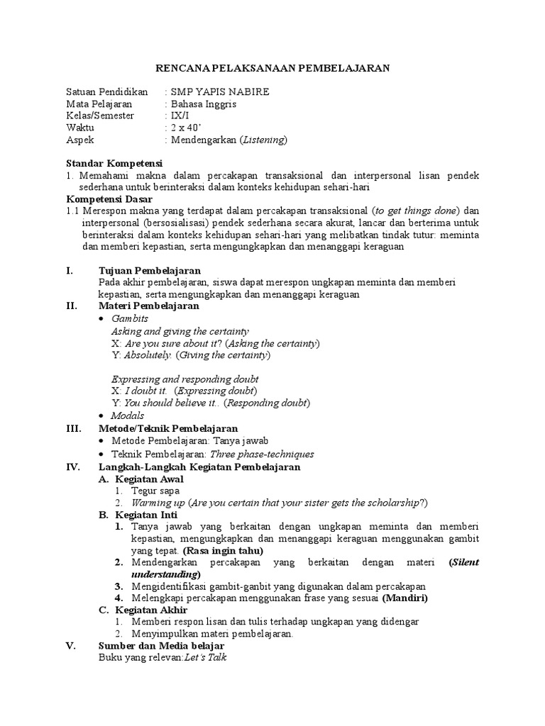 Rpp Smp Bahasa Inggris Ktsp Kelas 9 Semester 1 Doc