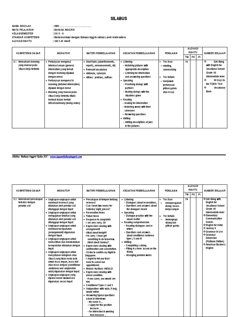 Silabus Bahasa Inggris SMA Kelas 10-12 KTSP Halo sobat IBI. Info Guru Silabus sma kurikulum 2013 revisi 2016 Bahasa Prancis Peminatan. Perangkat pembelajaran silabus kurikulum 2013 bahasa indonesia kelas 12 SMA yang akan saya bagikan pada postingan ini sudah lengkap yaitu mulai dari silabus bahasa indonesia semester 1 dan silabus semester 2 kelas 12 SMA.