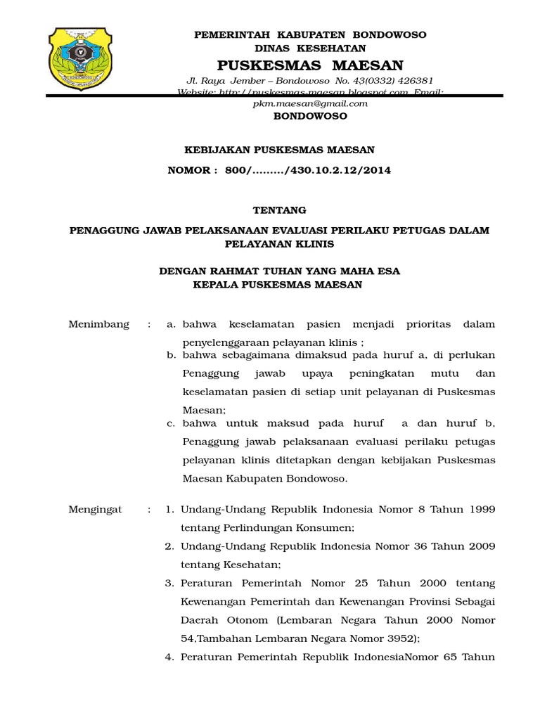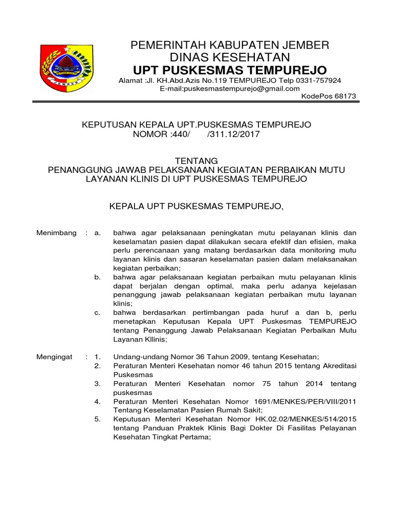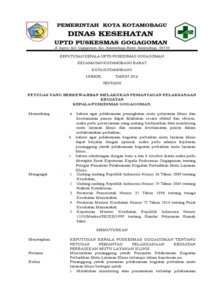 Rencana program perbaikan mutu layanan klinis dan keselamatan pasien 6. SK tentang petugas yang bertanggungjawab untuk pelaksanaan. Bahwa berdasarkan pertimbangan pada huruf a dan b perlu c.