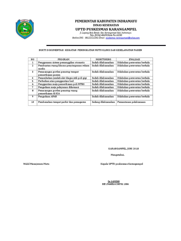 Ditetapkan Keputusan oleh Kepala UPT. Download View Sop 2393 Umpan Balik pelaporan Dari Pelaksana Kepada Penanggung Jawab Program Dan Kepala Puskesmas Untuk Perbaikan Kinerjadocx as PDF for free. 9425 Rencana program perbaikan mutu layanan klinis dan KP ada di 9133 9426 SK petugas pelaksanaan kegiatan yang direncanakan 9427 SK petugas pemantauan pelaksanaan kegiatan 9428 Bukti pelaksanaan 943.