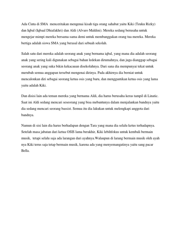 Di sini kamu akan belajar tentang persahabatan cinta dan tekad pantang menyerah. Nah di bab I ini kita paling dominan disuguhi karakterisasi pengenalan tokoh Fahri. Ada Cinta Di SMA merupakan film musikal romantis Indonesia 2016 yang diproduksi oleh Starvision Plus disutradarai oleh Patrick Effendy serta dibintangi oleh personel CJR Caitlin Halderman Gege Elisa Agatha Chelsea Cassandra Lee dan lainnya dengan latar belakang SMA dan masa remaja beranjak dewasa yang penuh cerita manis.