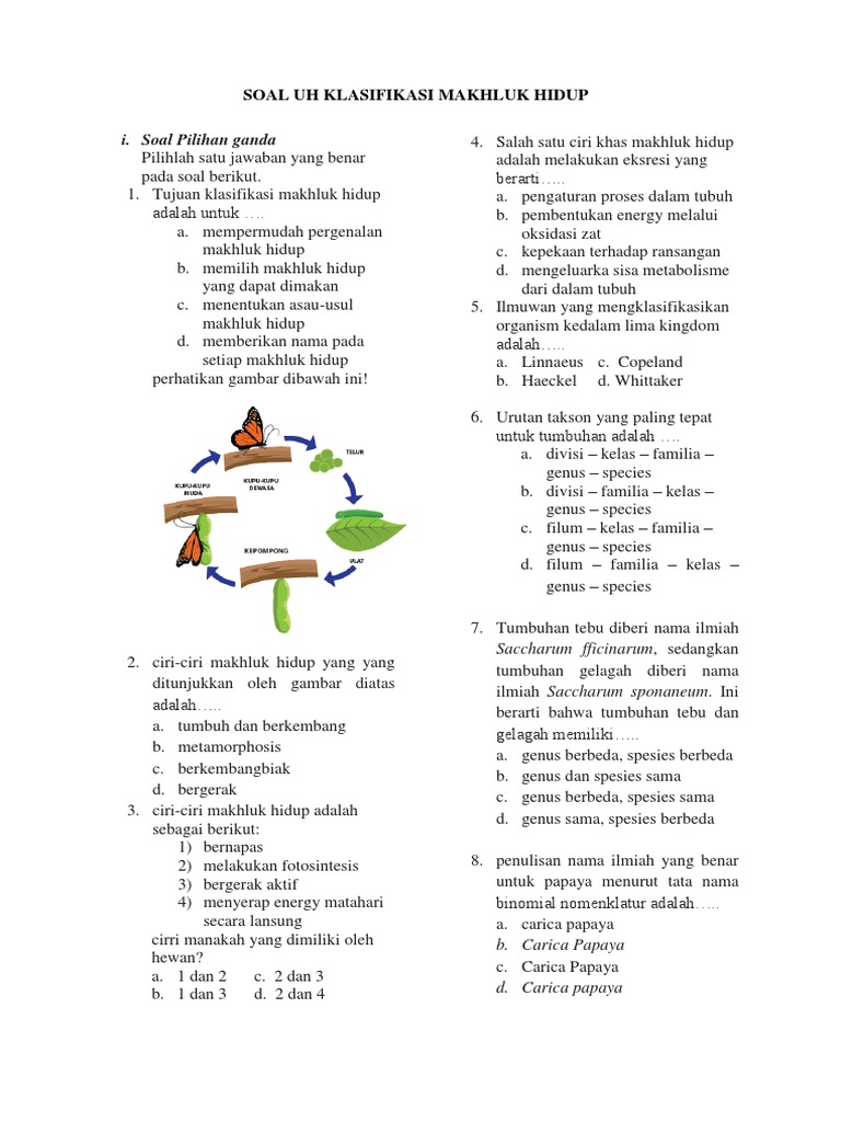 Soal dan jawaban klasifikasi makhluk hidup kelas 7 smp. Soal berbentuk pilihan ganda dengan jumlah soal 25 butir yang dilengkapi dengan kunci jawaban. Untuk lebih memahami materi klasifikasi makhluk hidup perhatikan 15 contoh soal klasifikasi makhluk hidup kelas 7 kurikulum 2013 dan jawabannya berikut ini. 1 Makhluk hidup dibagi menjadi dua kingdom.