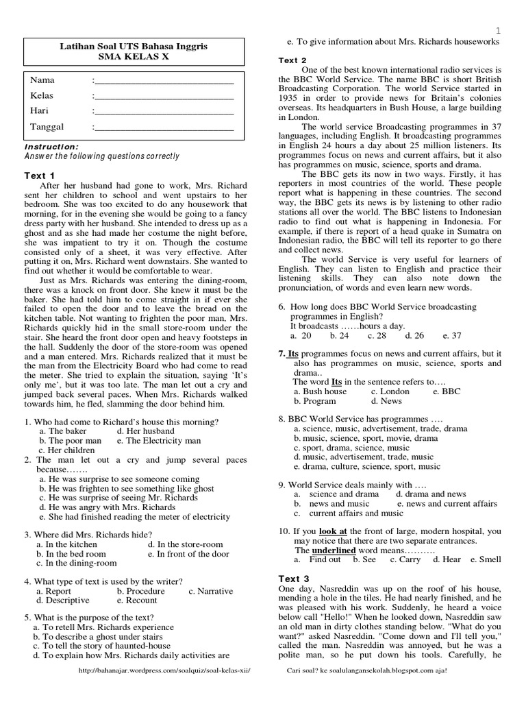 Soal Latihan Uts Sma Kelas X Bahasa Inggris Bbc English Language