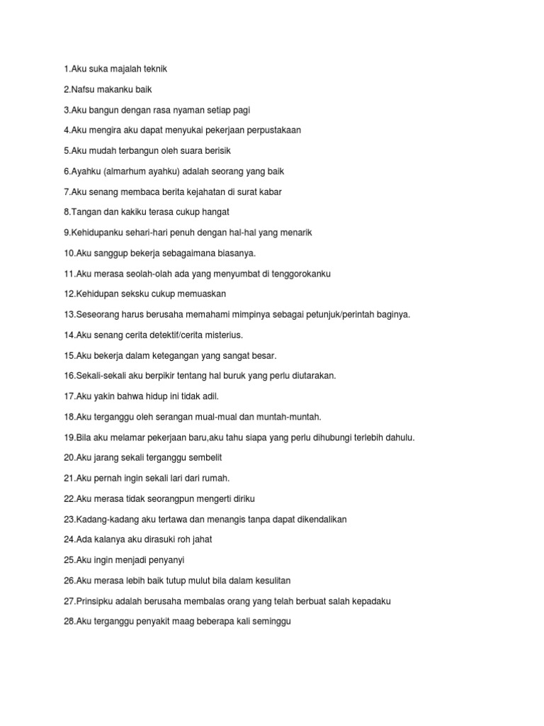 Unduh sebagai DOCX PDF TXT atau baca online dari Scribd Tandai sebagai konten tidak pantas Unduh sekarang Simpan Simpan Soal Tes Mmpi Untuk Nanti 89 9 89 menganggap dokumen ini bermanfaat 9 suara. Klik pada judul artikel untuk memulai membaca. Sudah banyak yang menyampaikan ke kami bahwa soalnya mirip banget.