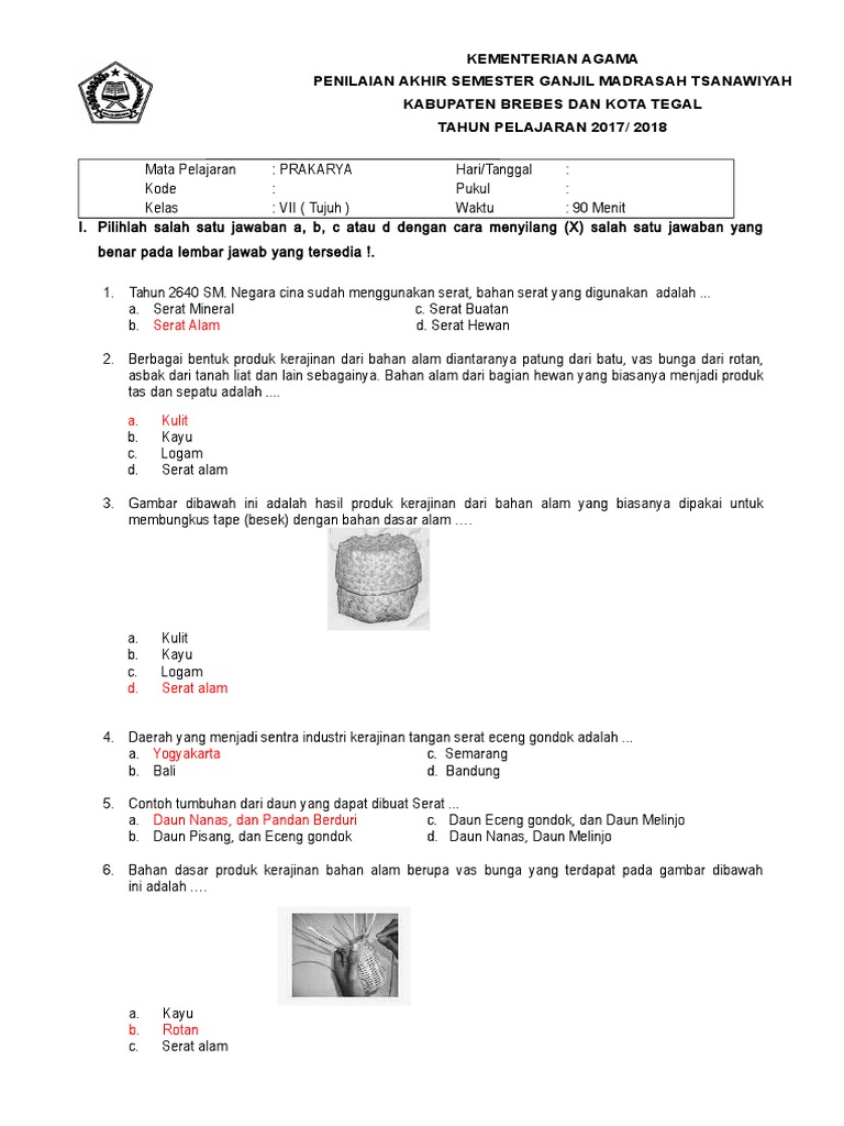 Produk kerajinan dari serat alam dan tekstil Siswa dapat C2 5 31. Soal Kunci Jawaban Prakarya Kerajinan Bahan Serat Alam Youtube Kisi Kisi Us Kls 3 Kur 2013 Elliot Smile Latihan Uas Soal Dan Jawaban Prakarya Kelas 7 Soal Prakarya Kls 8 Limbah Keras Soal Latihan Prakarya Aspek. Download Soal UAS Prakarya Kelas 7 Semester 2 dan Kunci Jawaban Kali ini penulis akan membagikan soal prakarya kelas 7 semester 2 pilihan ganda beserta jawabannya untuk dapat kalian pelajari untuk menghadapi ujian nanti.