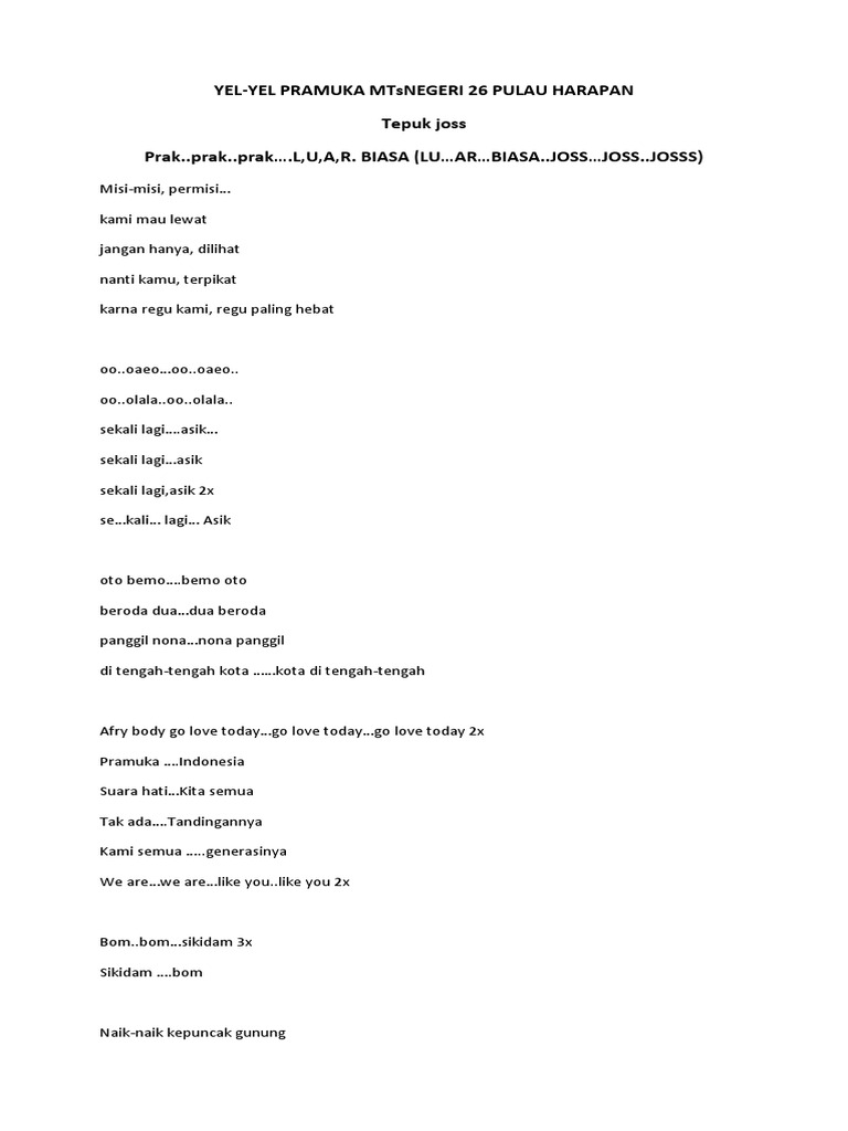 RequestYelYel SalamBelajarBerjuangBertakwa dan Fepyesta semarang. Yel yel pramuka dibawah ini juga bisa Anda rubah teks nya sesuai dengan nama regu atau kelompok Anda. Lagunya iklan mastin good kabar bahagia untuk kita semua murid baru murid yang paling hebat kami hadir dengan seluruh tekat.