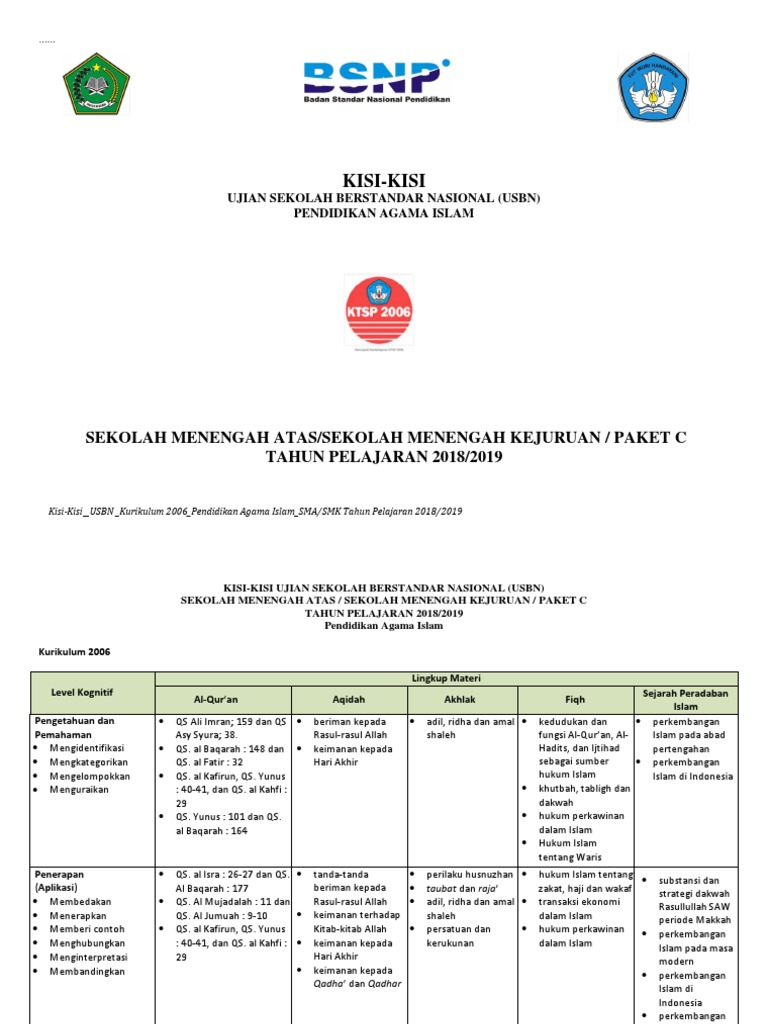 Kisi Kisi Usbn Pai Sma Smk 2018 Kurikulum 2006