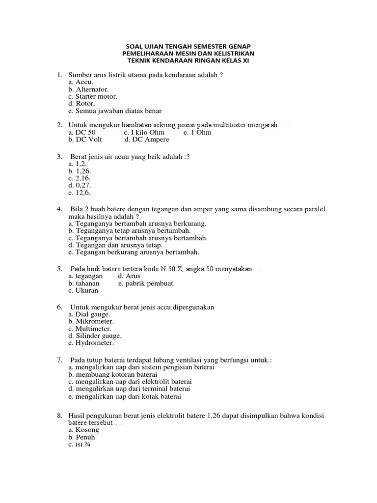Soal dan jawaban pemeliharaan kelistrikan kendaraan ringan kelas 11. Pada kesempatan kali ini admin telah membagikan latihan soal Teknologi Dasar Otomotif semester 1 kurikulum 2013. Soal Teknologi Dasar Otomotif kelas 10 ini diperuntukkan bagi adik-adik yang hendak mengikuti persiapan ujian semester ganjilgasal atau sebagai bahan latihan. Soal pemeliharaan mesin teknik kendaraan ringan kelas xi soal dan kunci jawaban soal engine dan komponennya otomotif kendaraan ringan dan sepeda motor latihan soal pmkr.