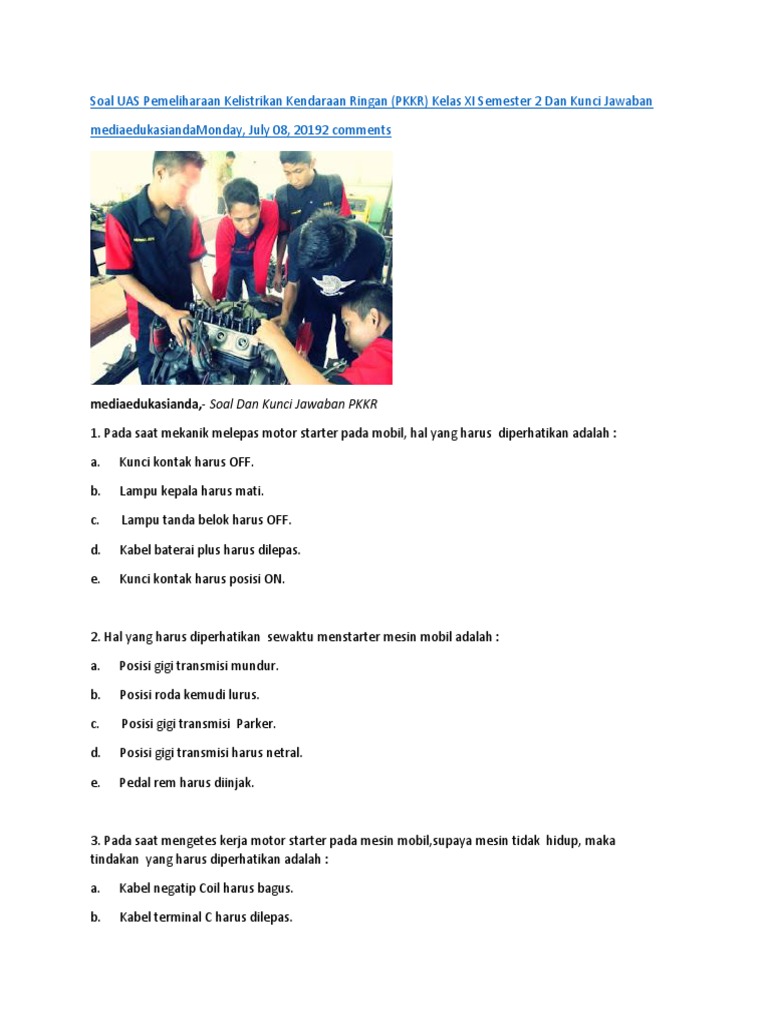 Soal UAS Pemeliharaan Kelistrikan Kendaraan Ringan PKKR Kelas XI Semester 2 Dan Kunci Jawaban mediaedukasianda- Soal Dan Kunci Jawaban PKKR 1. Soal ini terdiri dari 35 soal pilihan ganda dengan pilihan jawaban abcd dan e. Buku Teks Bahan Ajar Siswa ini bertujuan memberi bekal pengetahuan dan keterampilan kepada peserta didik tentang pemeliharaan sistem starter dalam paket keahlian Teknik Otomotif.