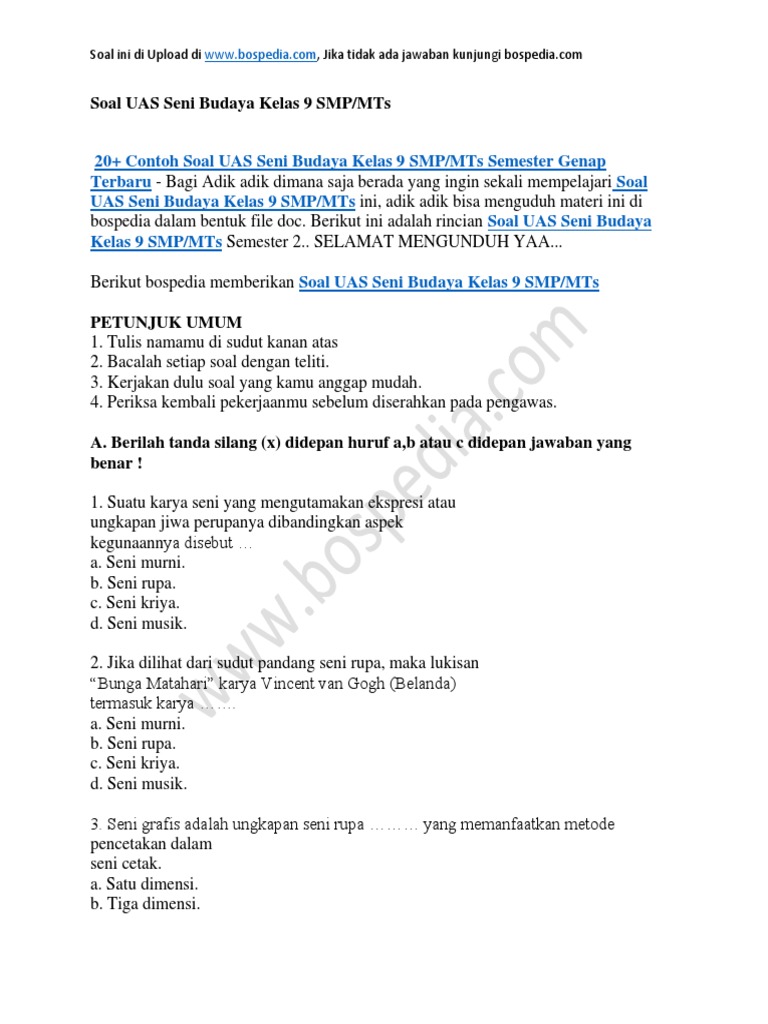 20 Contoh Soal Uas Seni Budaya Kelas 9 Smp Mts Semester Genap Docx
