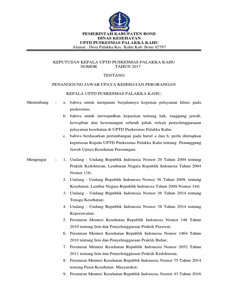 Download as DOCX PDF TXT or read online from Scribd Flag for Inappropriate Content save Save 2312 SK Penanggung Jawab UKM Dan UKP For Later 2 2 upvotes Mark this document as useful 1 1 downvote Mark this Share. Penanggung Jawab Jaringan pelayanan Puskesmas dan Jejaring Fasilitas Kesehatan. 2 Perubahan izin PAK dilakukan dengan mengajukan permohonan mengikuti tata cara sebagaimana.