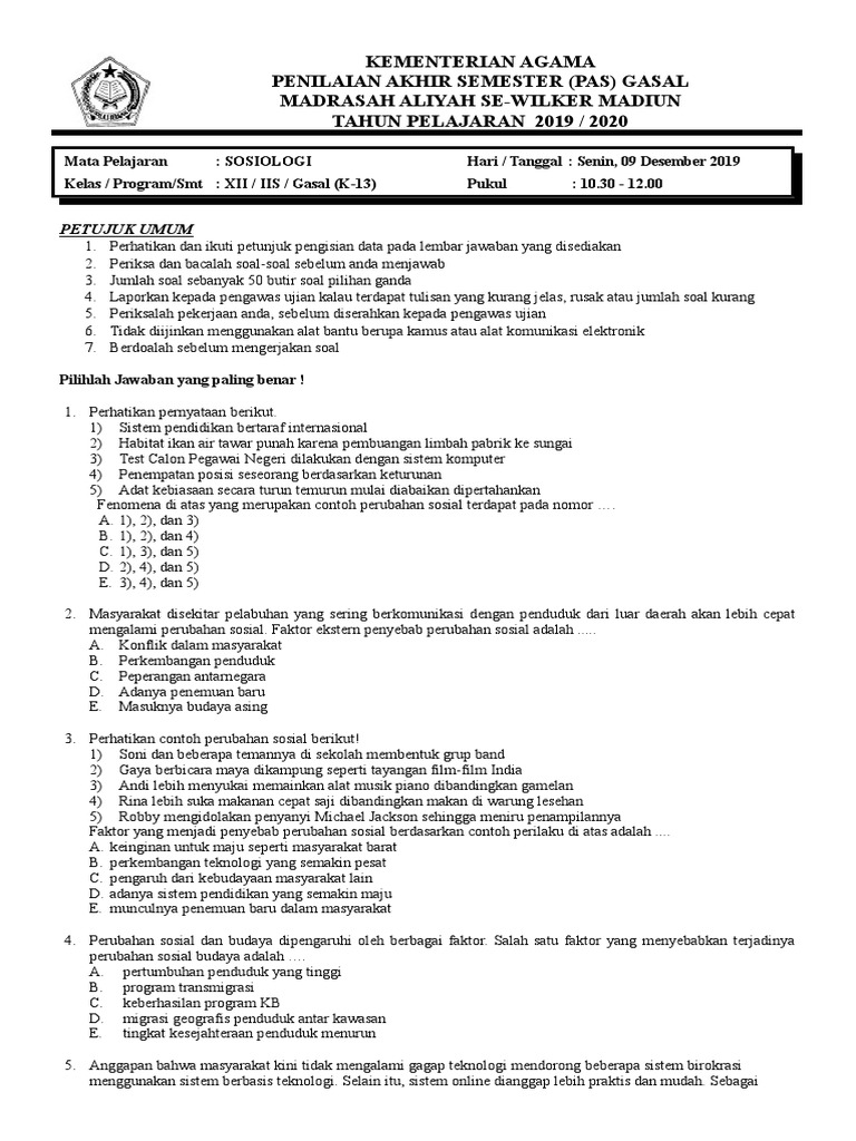 Soal Uas Sosiologi Kelas Xii Dan Kunci Jawaban