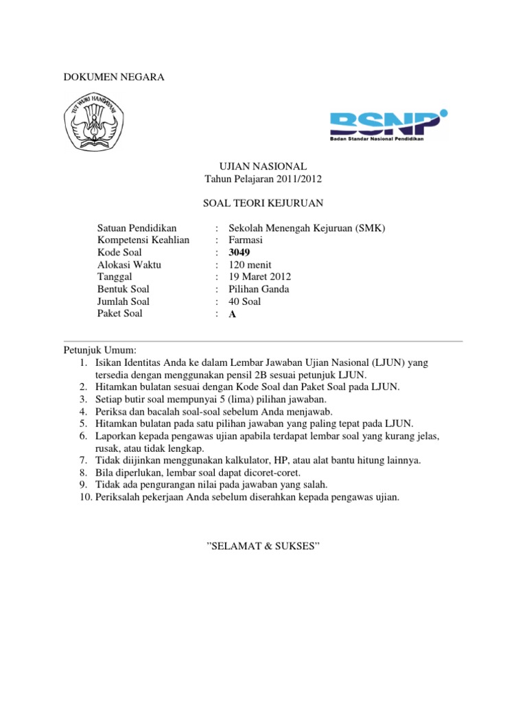 Berikut ini adalah Soal Teori Kejuruan Farmasi Sekolah Menengah Kejuruan SMK Ujian Nasional Tahun 2012 semoga dapat bermanfaat bagi anda. 3049 Alokasi Waktu.