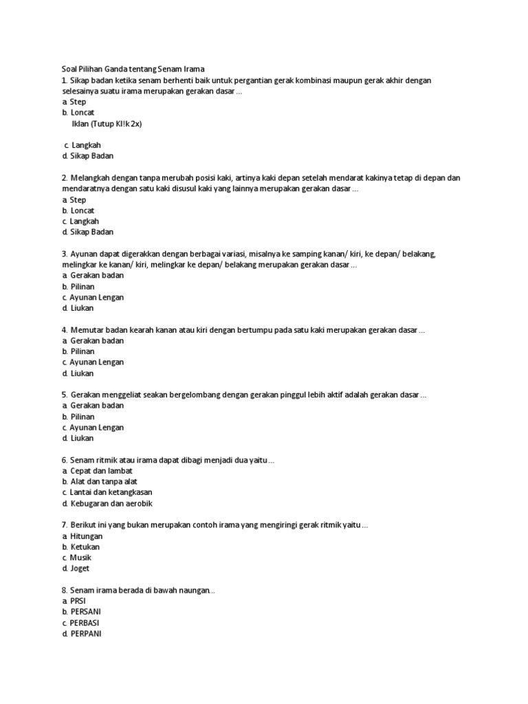 Sep 08 2020 Soal tentang senam lantai yang ada di artikel ini terdiri dari dua jenis soal yaitu soal pilihan ganda berjumlah 45 soal dan soal essay uraian dengan jumlah soal 5 soal. Soal Senam IramaRitmik Pilihan Ganda Jawaban Soal Kebugaran Jasmani 40 Soal Pilihan Ganda Ja. Untuk jumlah soal yang kami sajikan cukup banyak yaitu ada 50 soal senam ritmik.