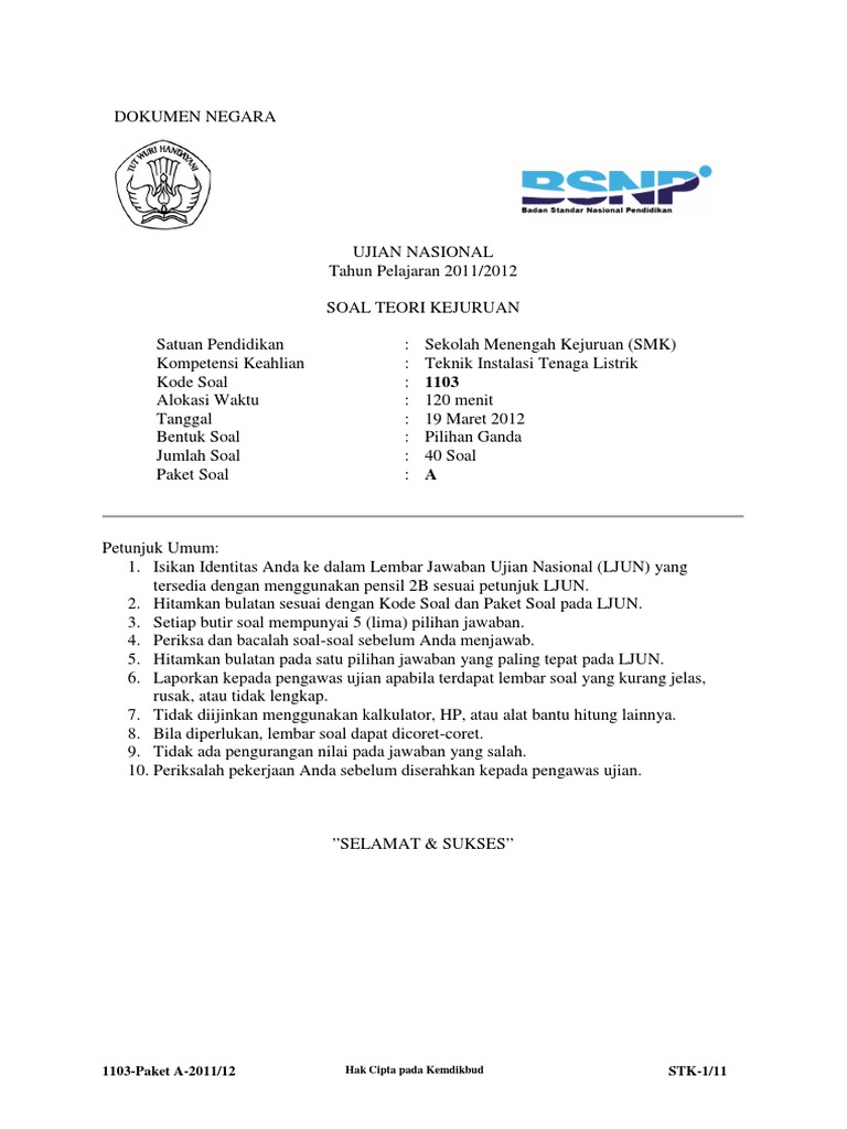 Soal Uji Kompetensi Keahlian Ujikom Teknik Instalasi Pemanfaatan Tenaga Listrik Sudah Ada Soal Uji Kompetensi Keahlian Ujikom Teknik Jaringan Tenaga Listrik. Sudah siapkah kita. Hitamkan bulatan sesuai dengan Kode Soal dan Paket Soal pada LJUN.