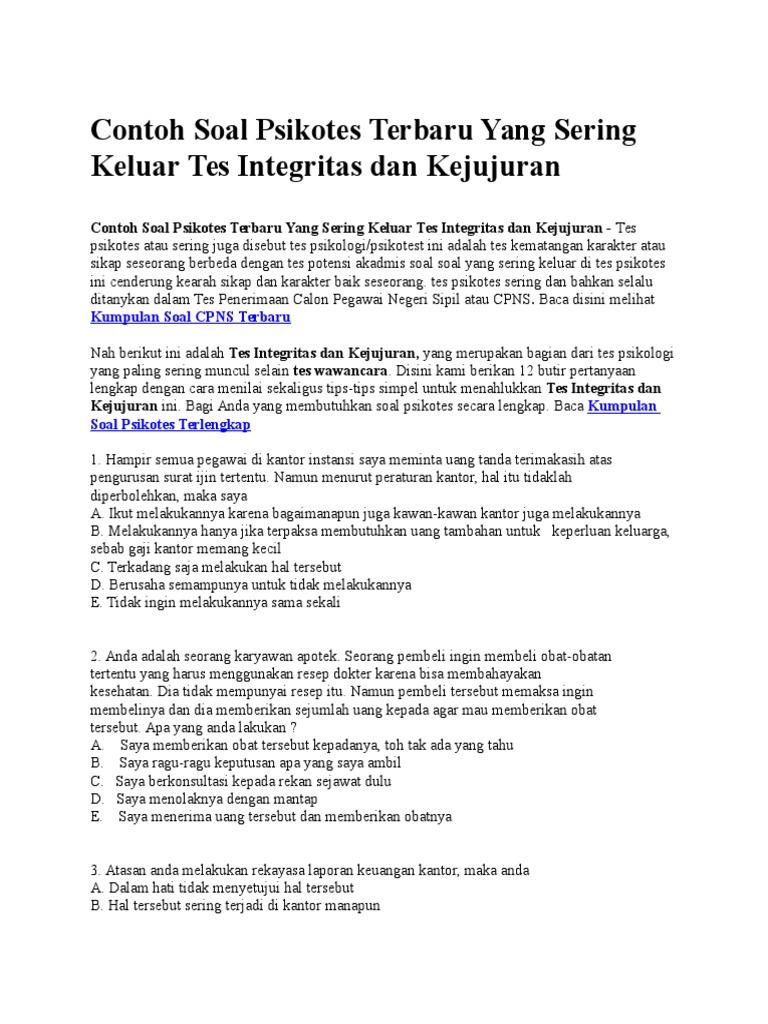 Contoh Soal Tes Psikologi Integritas Dan Kejujuran Ipdn 2018 Contoh Soal Psikotes Kerja