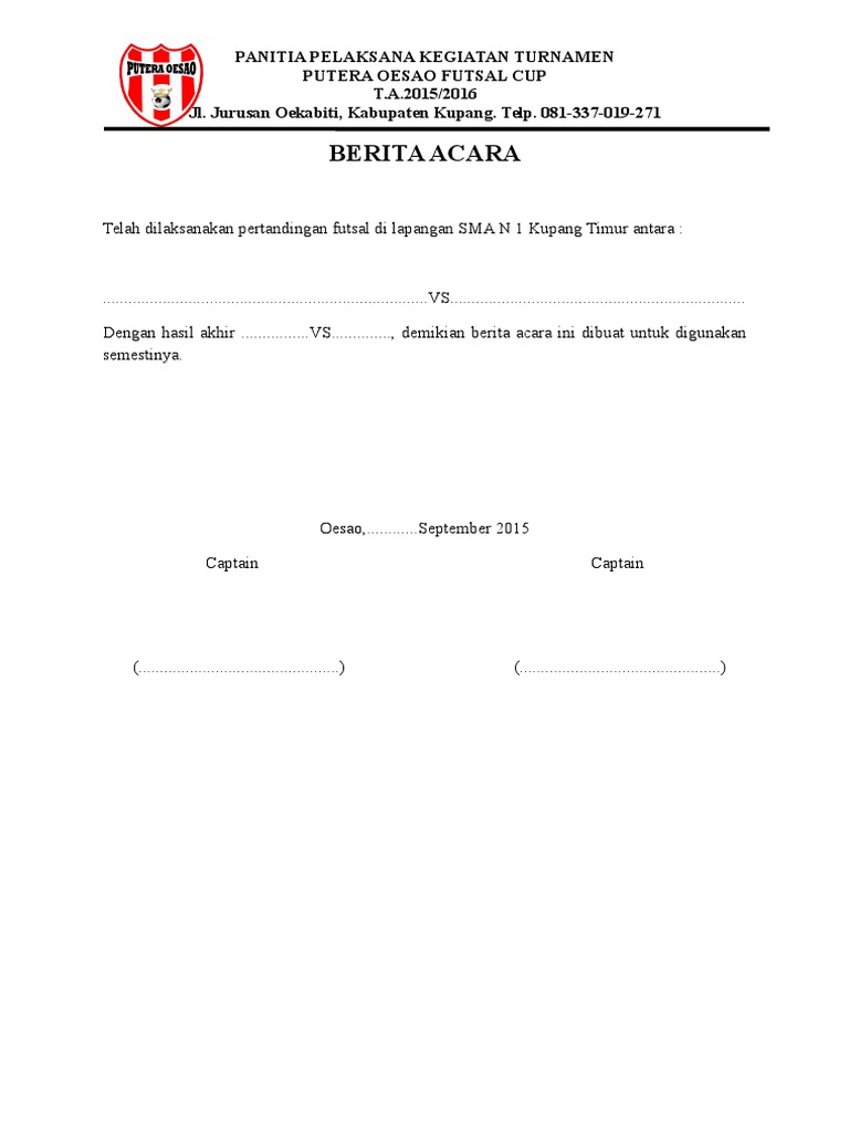 Contoh berita acara kehilangan contoh berita acara kerusakan contoh berita acara pemeriksaan contoh berita acara kegiatan contoh berita acara kejadian contoh berita acara pembayaran contoh berita acara penyerahan barang contoh berita acara rapat contoh berita acara kerusakan. Undangan Open Turnamen Bola Voli Wahidi Cup 2012. Berikut amandemen futsal terkait asisten wasit.