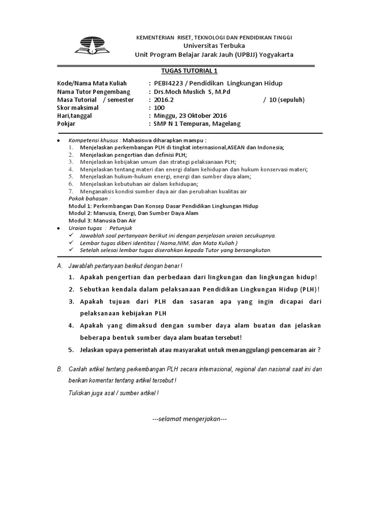 Soal Ujian Ut Pgsd Pebi4223 Pendidikan Lingkungan Hidup Disertai Kunci Jawaban Soalut Com