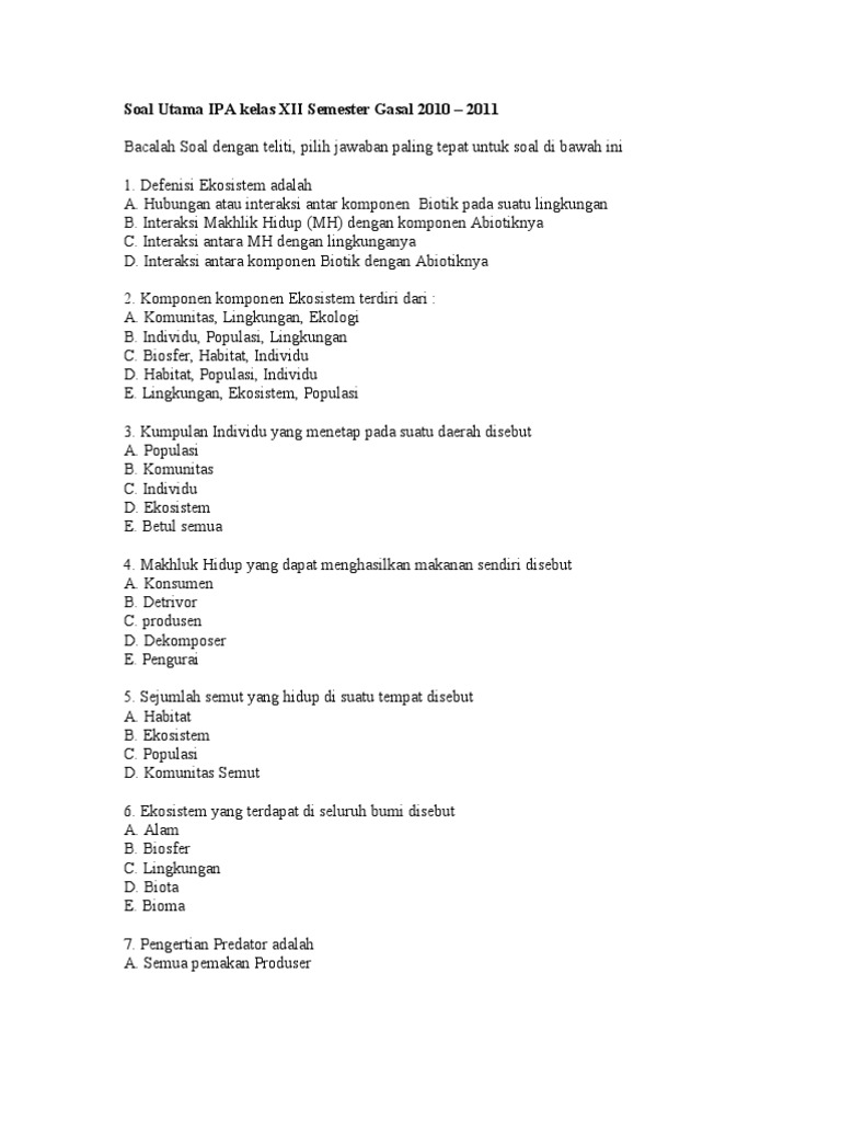 Jika teman membutuhkan Soal IPA kelas XII ini Baik untuk print out maupun hal penting lainnya Silahkan hubungi saya lewat kontak saya yang tertera dibawah blog ini - Terima kasih. 50 soal biologi ekosistem dan jawabannya pilihan ganda dan essay 3. 30 soal pilihan ganda bab ekosistem dan jawaban - Soal yang akan kami bagikan dalam artikel ini yaitu soal atau pertanyaan tentang ekosistem.