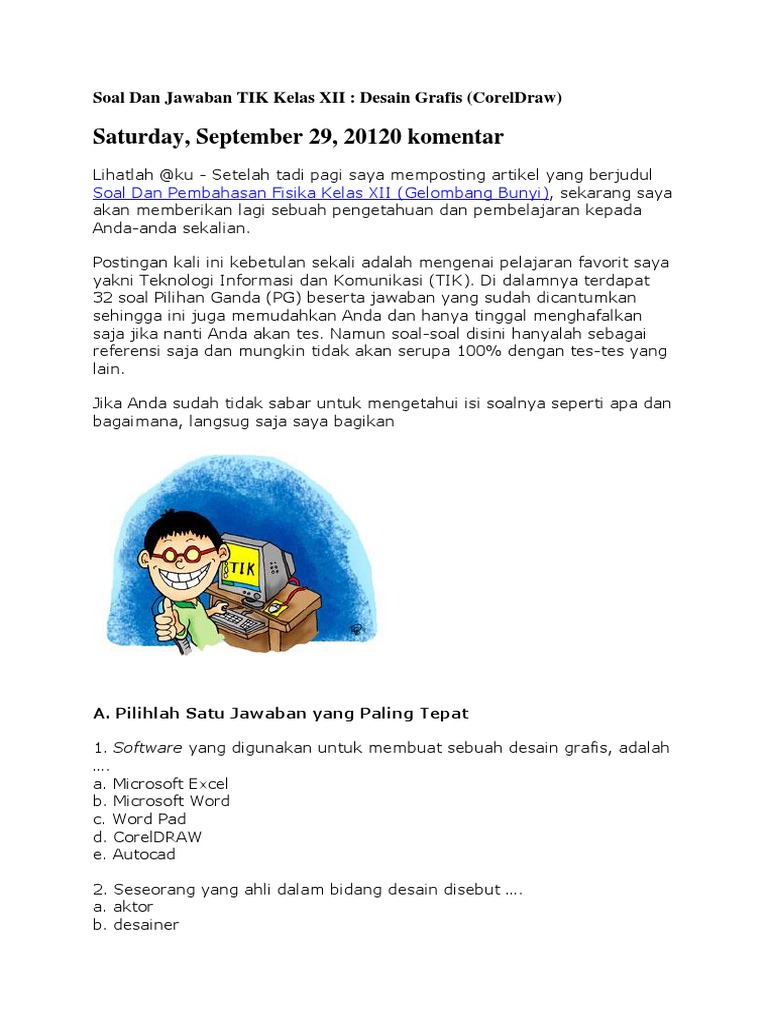 Desain Grafis CorelDraw Postingan kali ini kebetulan sekali adalah mengenai pelajaran favorit saya yakni Teknologi Informasi dan Komunikasi TIK. Soal dan Jawaban PASUAS TIK Kelas 7 Semester 1 SMPMTs Kurikulum 2013 TP 20202021 Pada postingan sebelumnya admin sudah berbagi informasi tentang Soal dan Jawaban PASUAS SBK Kelas 7 Semester 1 SMPMTs Kurikulum 2013 TP 20202021 kali ini admin kembali akan mengupdate informasi yang berkaitan dengan Penilaian Akhir Semester PAS atau Ulangan Akhir Semester UAS khususnya Mata. Lansung saja kami memberikan contoh soal TIK kelas 11 untuk siswa SMAMASMK Sederajat semester 1 dan 2.