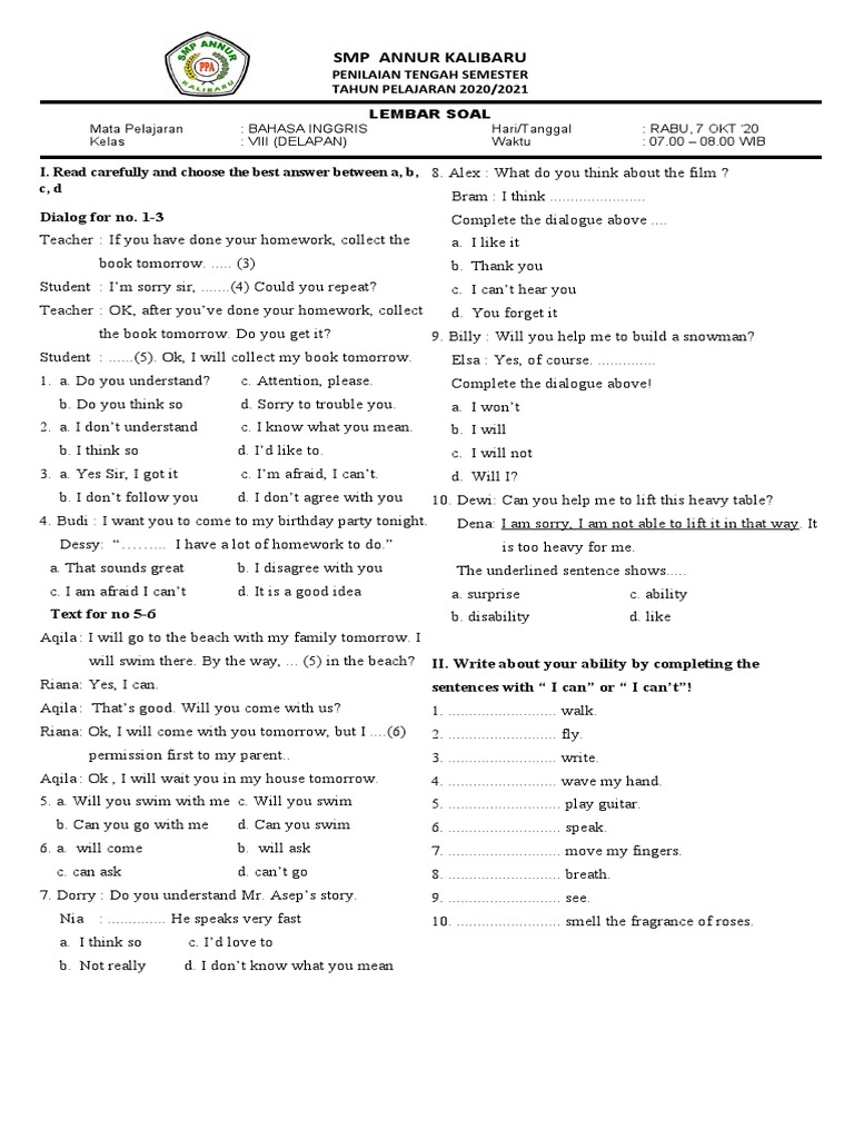 The dialog is for questions number 1-3. Soal ini sudah kakak susun sebanyak 50 soal yang didalamnya hanya terdapat soal pilihan ganda saja tidak ada soal essay. Dapatkan soal latihan Ulangan Kenaikan Kelas Ujian Akhir Semester Mata Pelajaran Bahasa Inggaris Kelas VII Sekolah Menengah Pertama Madrasah Tsanawiyah Semester II Genap sesuai dengan kurikulum 2013 Kurtilas K 13 plus kunci jawabannya tahun ajaran 2019.