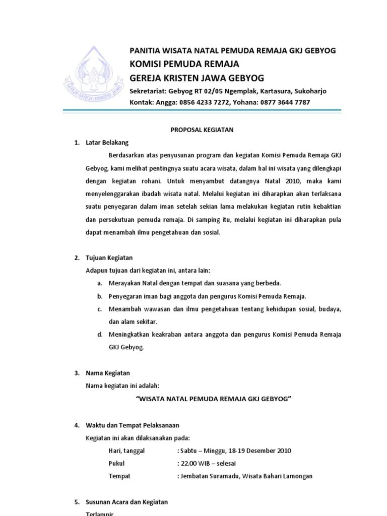 Contoh proposal kegiatan rekreasi. WISATA WARGA KE CIATER JAWA BARAT. Contoh proposal pengajuan dana kegiatan lomba. PROPOSAL KEGIATAN STUDI WISATA SMA TUNAS BANGSA BOGOR.