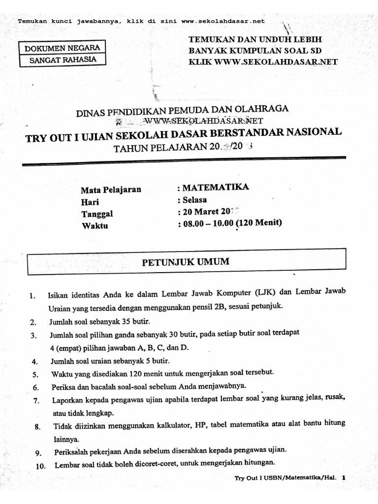 Soal Try Out I Usbn Sd Mi 2019 Dan Kunci Jawabannya Sekolahdasar Net. Video Soal Try Out Matematika Kelas 6 SD. Contoh Soal Try Out Matematika Kelas 6 SDMI dan Kunci Jawabannya 2020.